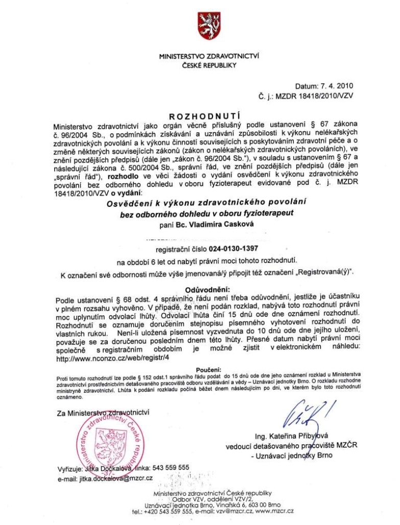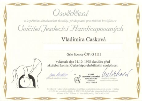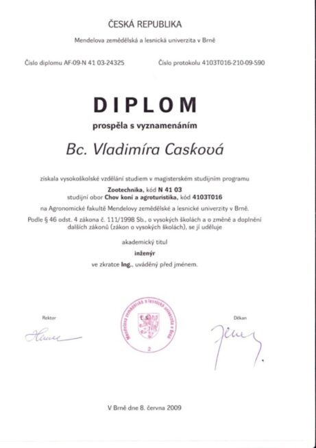 Ing. et Bc. Vladimíra Casková – fyzioterapeutka, příprava koní pro HR